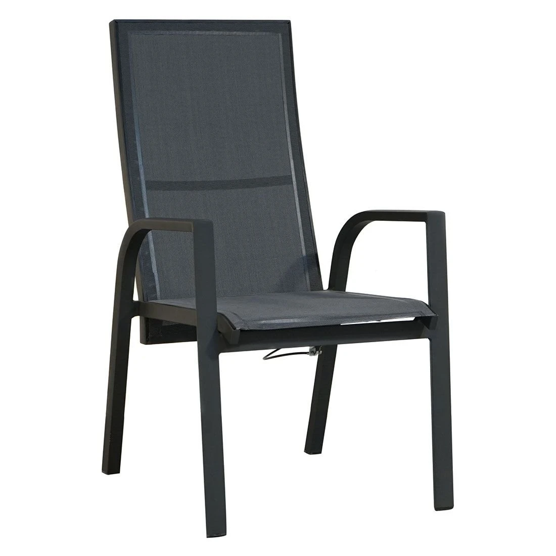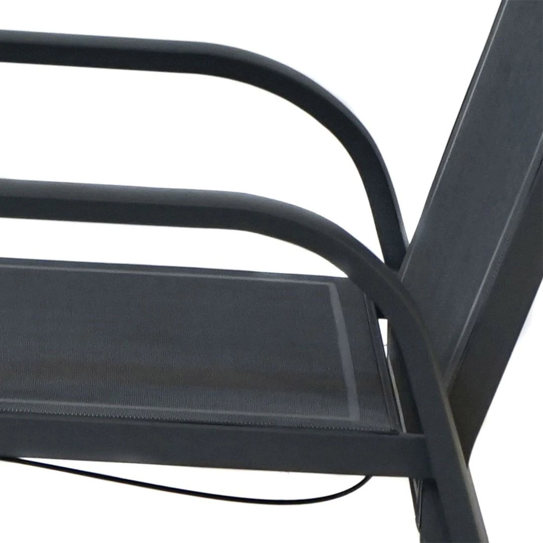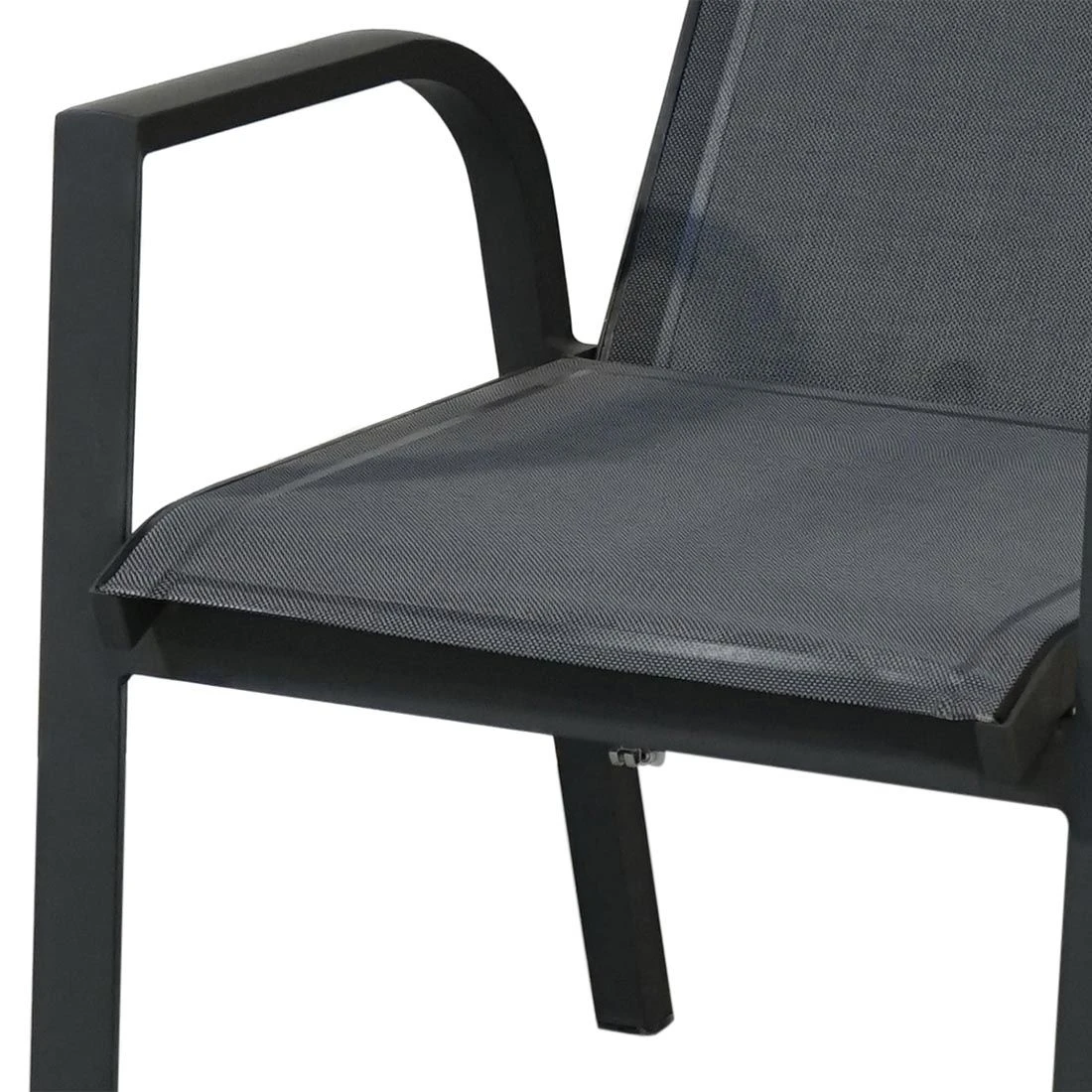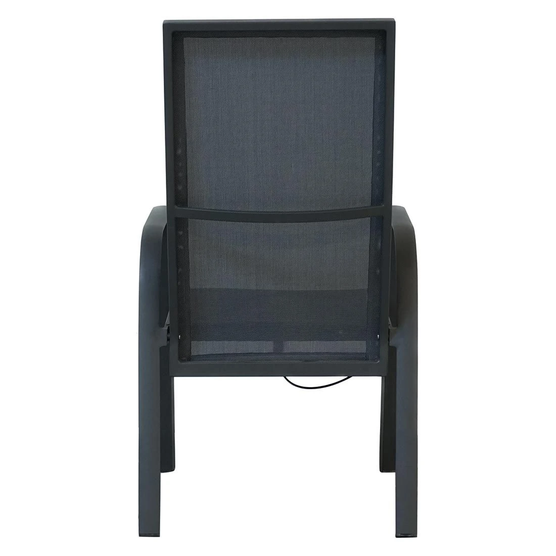 Das Gestell besteht aus pflegeleichtem und wetterfestem Aluminium. Für eine attraktive Optik ist das Gestell im Farbton Anthrazit gehalten. Ein weiterer Pluspunkt des Stapelsessels ist die Bespannung mit Textilene. Dieser Bezugsstoff überzeugt durch eine hohe Robustheit gegenüber Hitze und Frost und ist leicht zu reinigen. Die Sitzfläche ist in ansprechendem Grau gehalten.