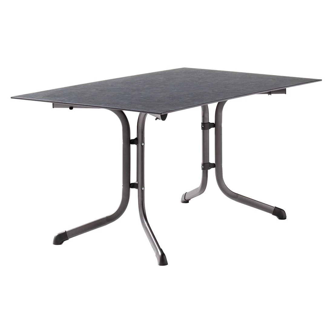 Das robuste Gestell-Material des Klapptisches besteht aus Stahl. Optisch ist das Gestell in Eisengrau gehalten. Die Polytec-Tischplatte ist nicht nur ein optischer Hingucker, sondern besitzt auch beste Materialeigenschaften für Draußen. Die Platte ist wetter-, kälte- und kratzfest und damit der perfekte Begleiter für Ihren Outdoor-Bereich. Für ein elegantes Gesamtbild erscheint die Platte in der Farbe Schiefer. Mit der rechteckigen Form lässt sich der Klapptisch platzsparend in Ecken oder an Häuserwänden aufstellen.