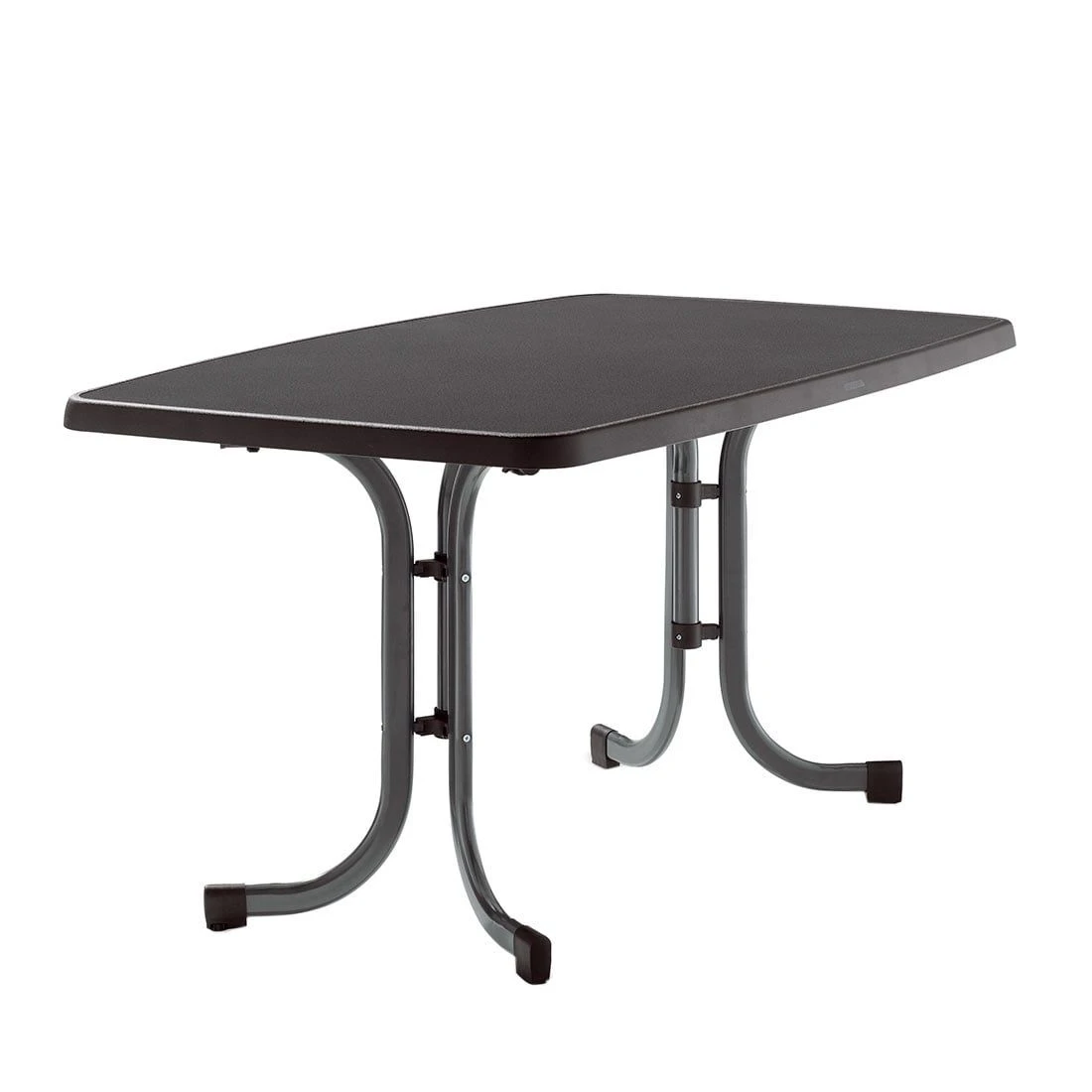 Seine Stabilität erhält der Tisch durch das robuste Tischgestell aus Stahl. Farblich ist das Gestell in Eisengrau (Anthrazit) gehalten. Für die Tischplatte wird das hochwertige Material „Mecalit“ verwendet. Die Beschichtung aus Melamin macht die Platte wetter-, kälte-, und schlagfest und somit zum perfekten Begleiter für Draußen. Farblich ist die Tischplatte in einem schönen Anthrazit gehalten. Das klassische Vierfuß-Gestell garantiert Ihnen maximale Beinfreiheit. Die Form des Klapptisches ist klassisch rechteckig gehalten.