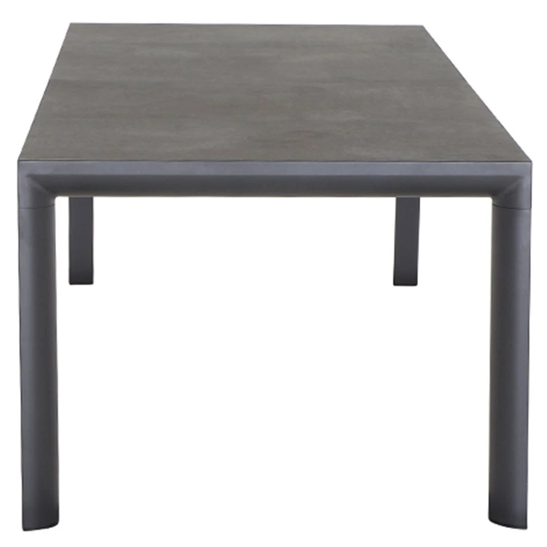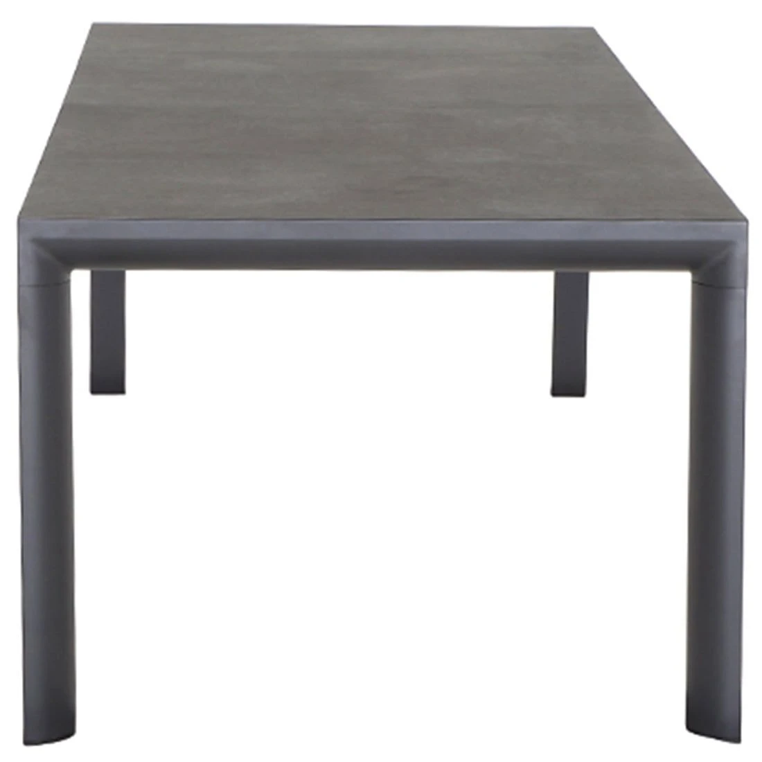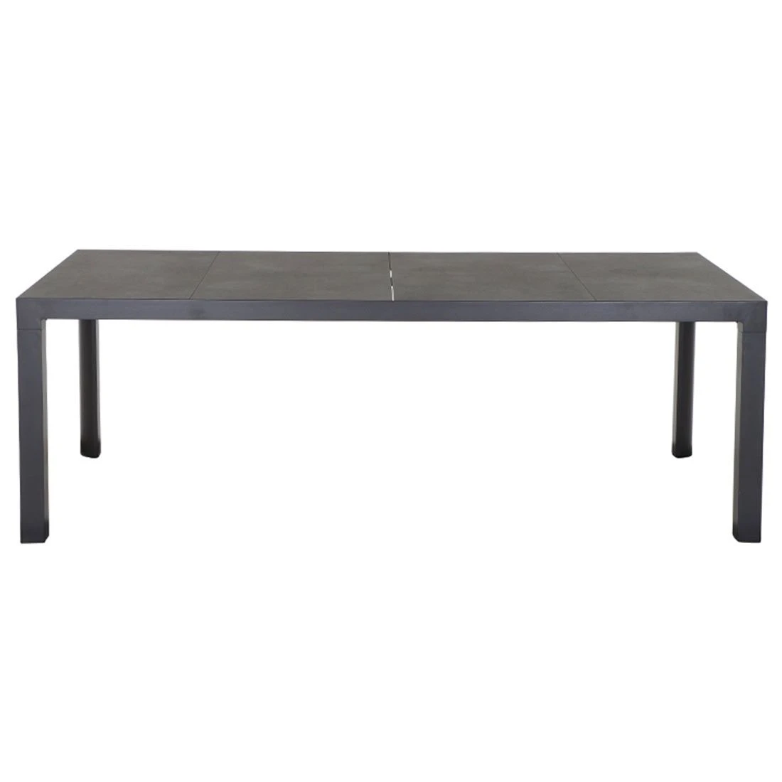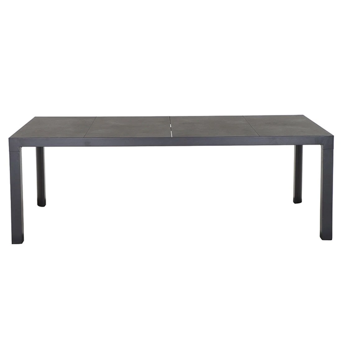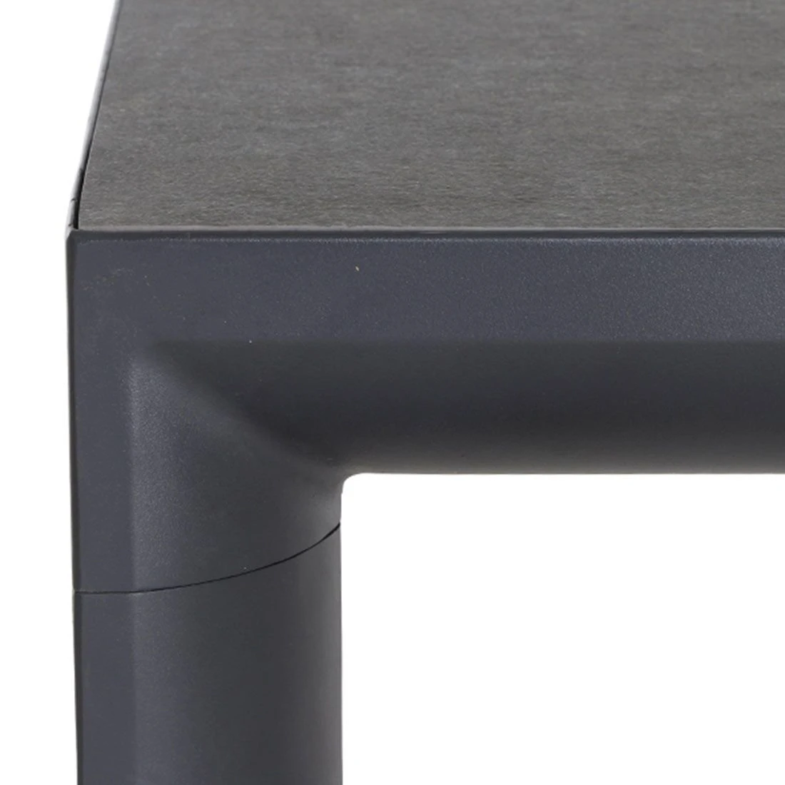 Das Gestell des attraktiven Tisches ist aus Aluminium hergestellt. Keramik ist das Material, das für die Tischplatte gewählt wird. Das robuste Material ist nicht so schwergewichtig wie Naturstein, sorgt allerdings ebenso für windsicheren Halt im sommerlichen Garten. Farblich sind Gestell und Tischplatte einheitlich gestaltet und begeistern in Anthrazit. Klassisch aus vier Tischbeinen besteht das Gestell des Tisches. Mit der rechteckigen Form lässt sich der Gartentisch platzsparend in Ecken oder an Häuserwänden aufstellen.