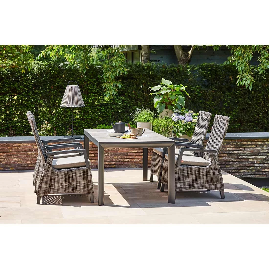 Das Gestell besteht aus pflegeleichtem und wetterfestem Aluminium. Für eine attraktive Optik ist das Gestell im Farbton Anthrazit gehalten. Ein hochwertiges Gardino®-Geflecht umgibt das robuste Gestell und verleiht dem Gartensessel damit einen ganz besonderen Look. Farblich begeistert der Bezug in elegantem Taupe-Meliert.