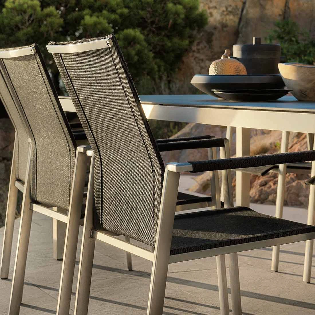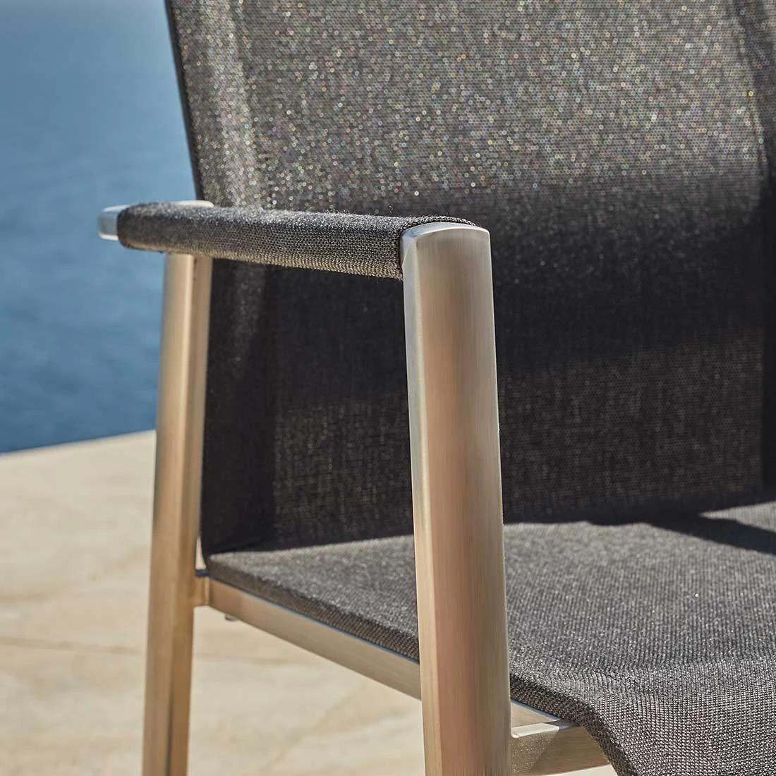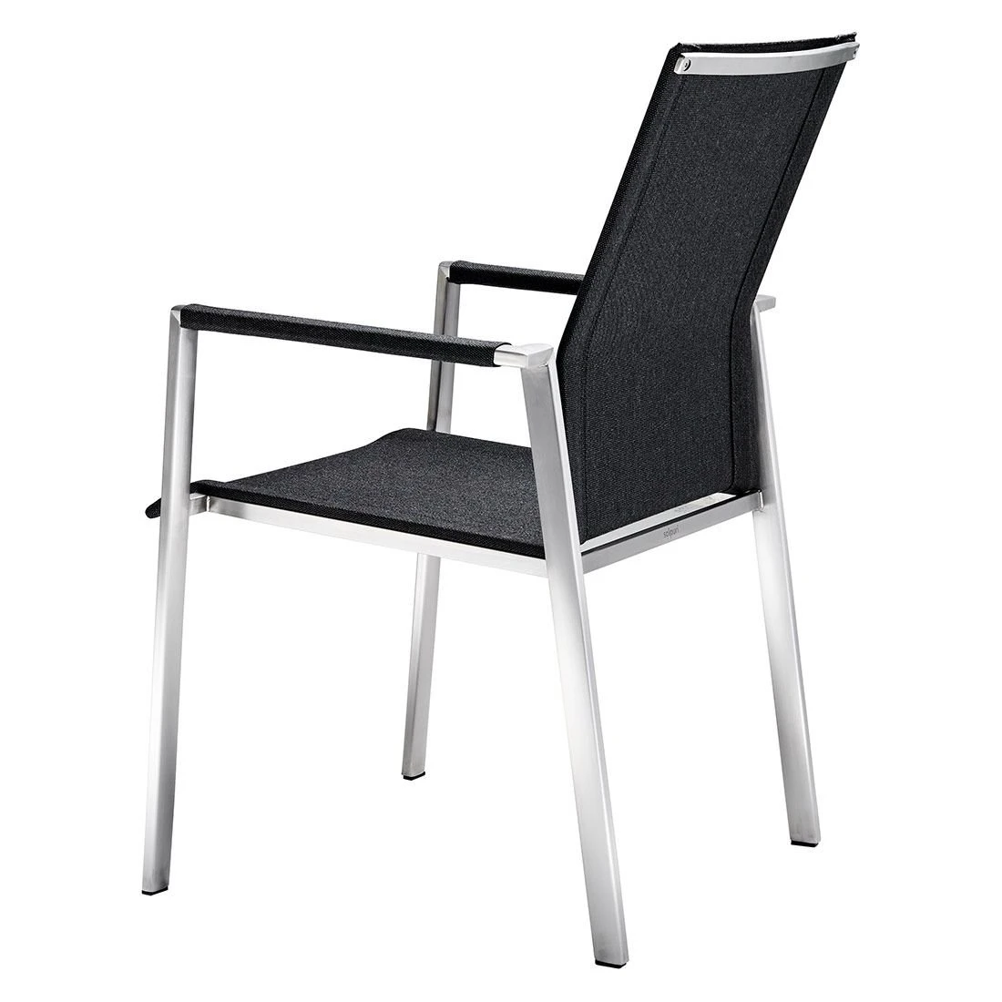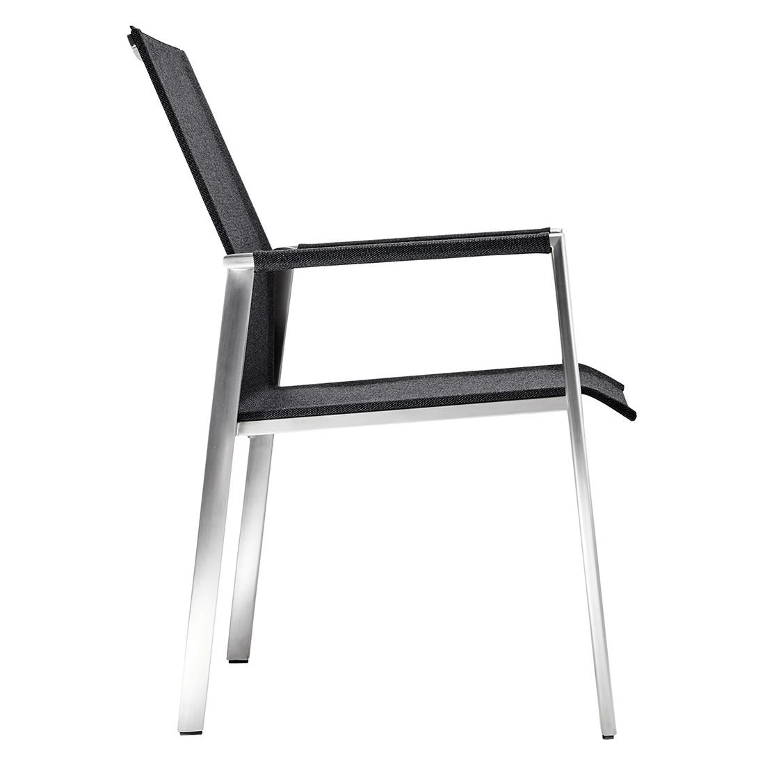 Das Gestell des Stapelsessels besteht aus hochwertigem und pflegeleichtem Edelstahl. Neben seiner ansprechenden Optik bietet dieses Material auch eine hohe Stabilität. Für eine attraktive Optik ist das Gestell im Farbton Silber gehalten. Ein weiterer Pluspunkt des Stapelsessels ist die Bespannung mit Textilene. Dieser Bezugsstoff überzeugt durch eine hohe Robustheit gegenüber Hitze und Frost und ist leicht zu reinigen. Die Sitzfläche hat eine schöne Farbgebung in Coal.