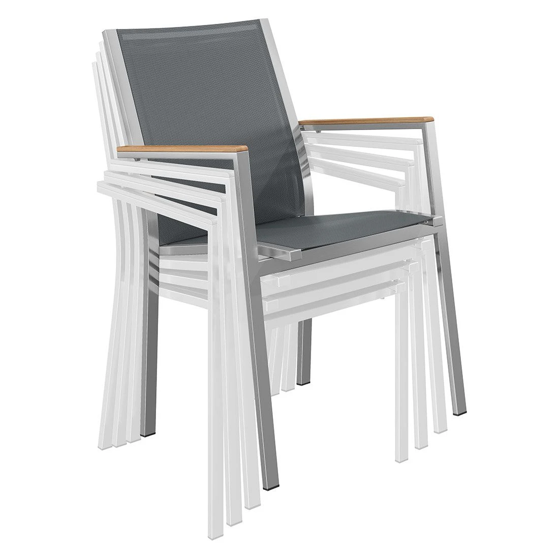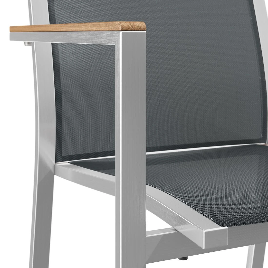 Die robusten Edelstahlgestelle sorgen für eine hohe Stabilität und Tragfähigkeit. Darüber hinaus begeistern diese mit einem zeitlos eleganten Look. Optisch ansprechend ist die Farbgebung der Gestelle in Silber. Ein weiteres Highlight ist die Bespannung der Sitzflächen mit Textilene. Dieses Material zeichnet sich durch eine hohe Robustheit gegenüber Hitze und Frost aus und ist leicht zu reinigen. Die Farbgebung der Sitzfläche ist Silbergrau. Im Preis des Sets ist ein passender Tisch enthalten. Teak ist außergewöhnlich widerstandsfähig gegen Witterungseinflüsse wie Temperaturschwankungen, Nässe und Trockenheit. Kein Wunder, dass dieses hochwertige Holz als Material für die Tischplatte verwendet wird. Farblich überzeugt die Tischplatte in Natur. Als klassische Design-Komponente fungiert das geradlinige Vierfußgestell. Mit der rechteckigen Form lässt sich der Tisch platzsparend in Ecken oder an Häuserwänden aufstellen.
