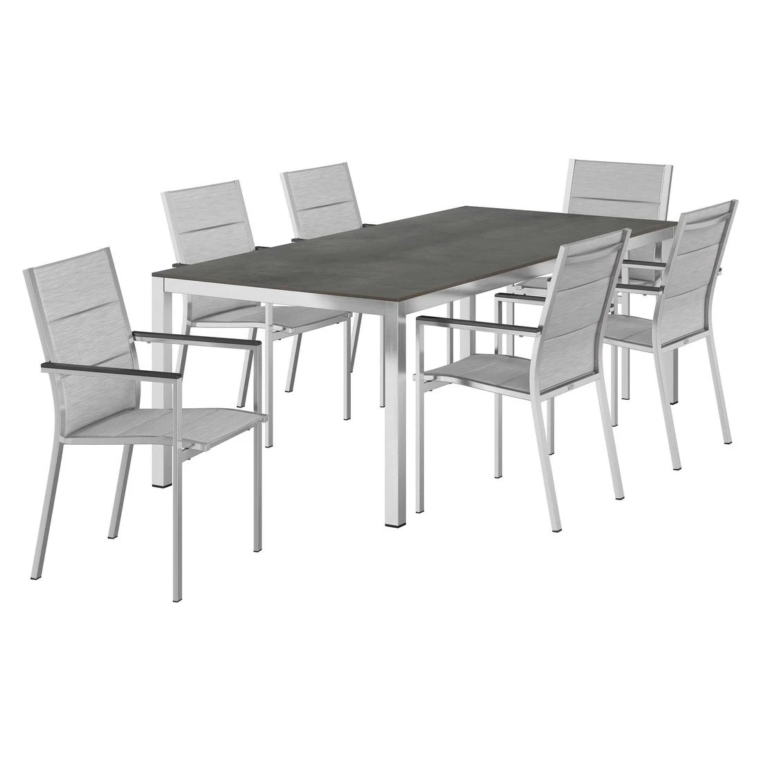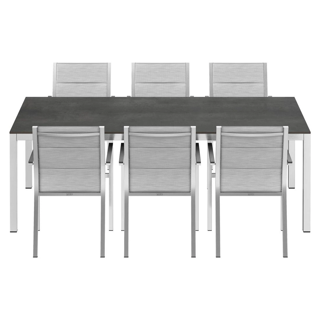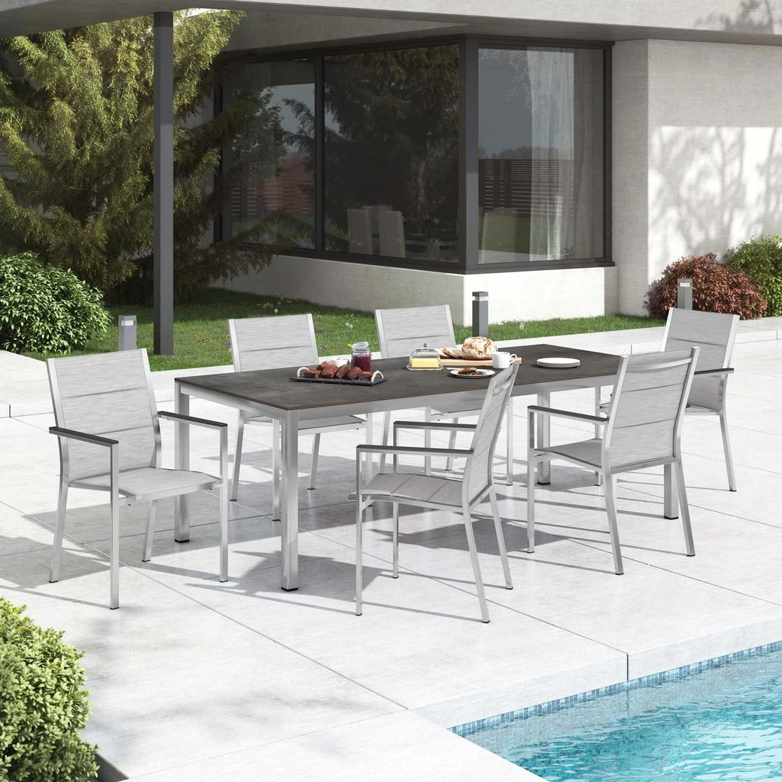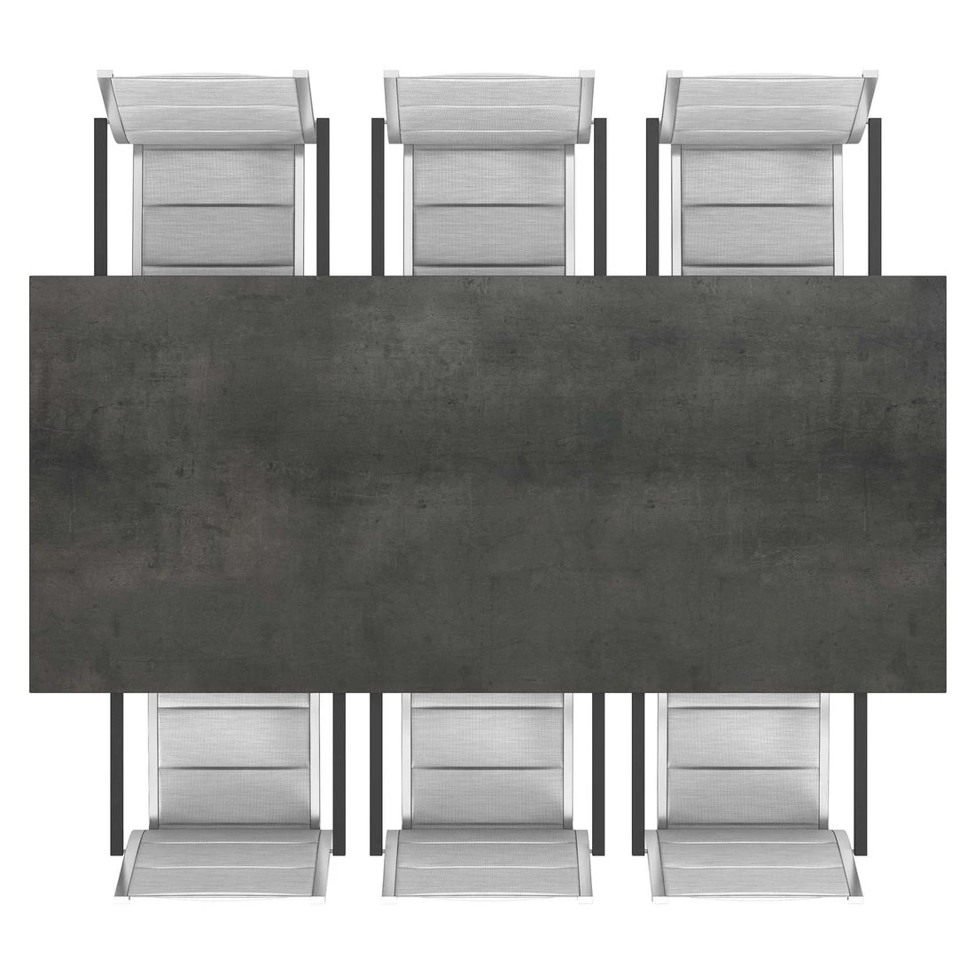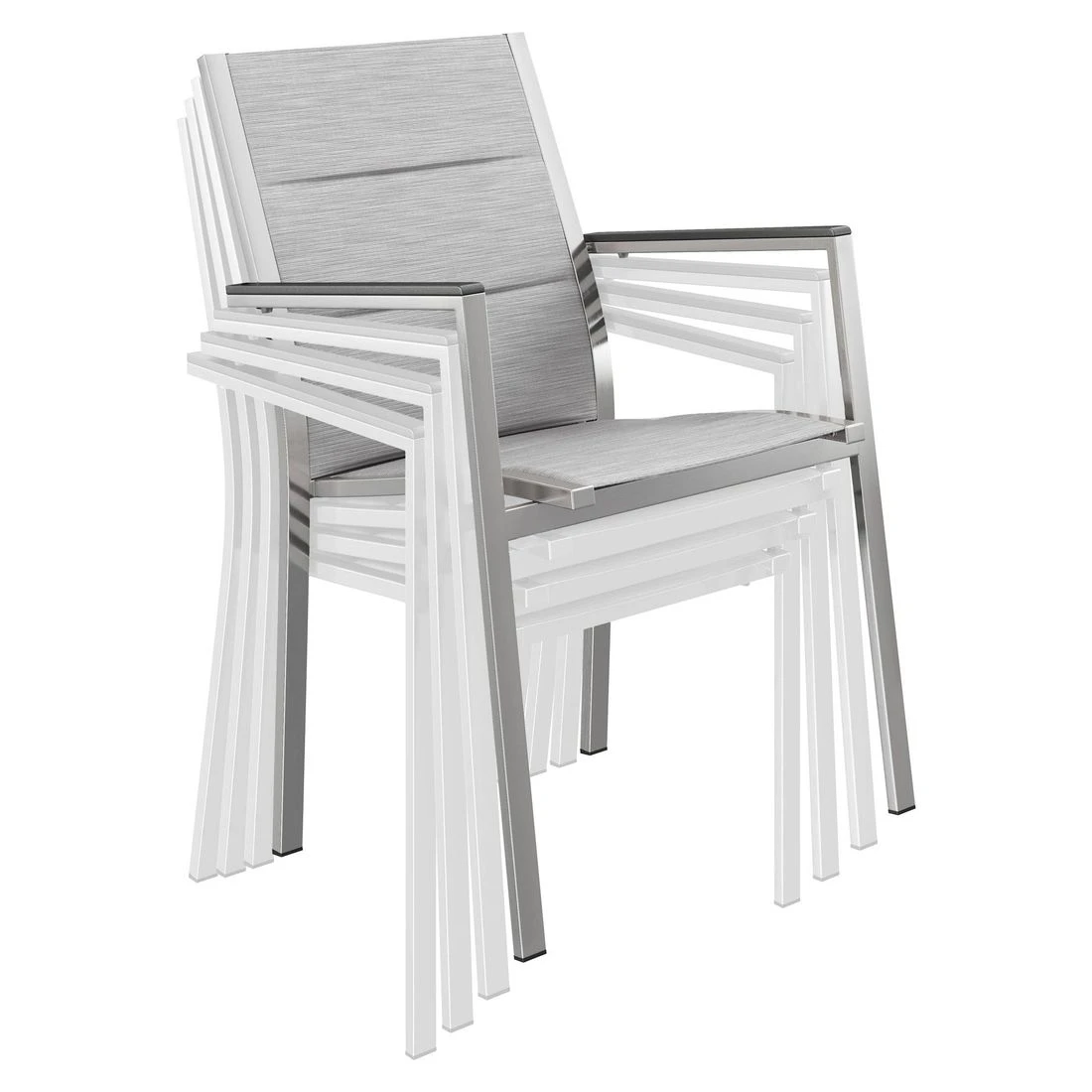 Die Gestelle sind aus Edelstahl gefertigt und sorgen somit für einen modernen Look und eine hohe Stabilität. Ein weiterer Pluspunkt der Sitzmöbel ist die Bespannung der Sitzflächen mit Textilene in der Farbe Silber. Dieses Material zeichnet sich durch eine hohe Robustheit gegenüber Hitze und Frost aus und ist leicht zu reinigen.