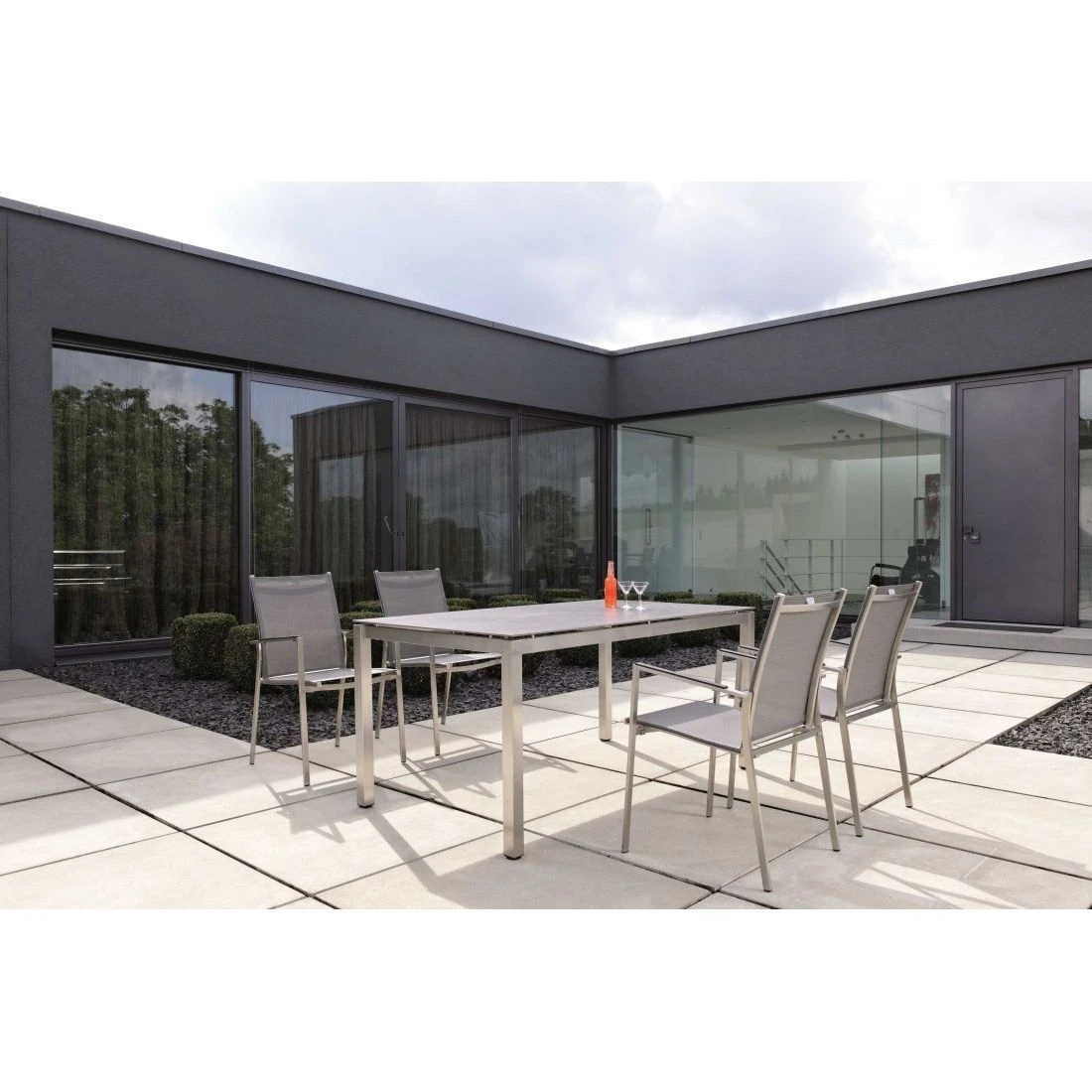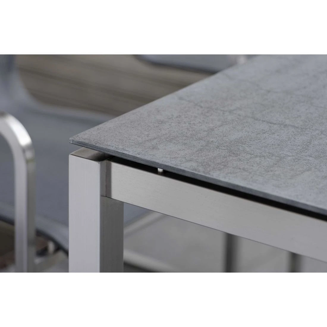 Das Gestell besteht aus pflegeleichtem und rostfreiem Edelstahl. Das klassische Vierfuß-Gestell garantiert Ihnen maximale Beinfreiheit. Das Tischgestell ist klassisch rechteckig gestaltet. An diesem Tischgestell finden 6 Personen Platz. Damit bietet dieses Modell genügend Sitzplätze für die ganze Familie – egal ob zum Frühstück, Mittag- oder Abendessen.
