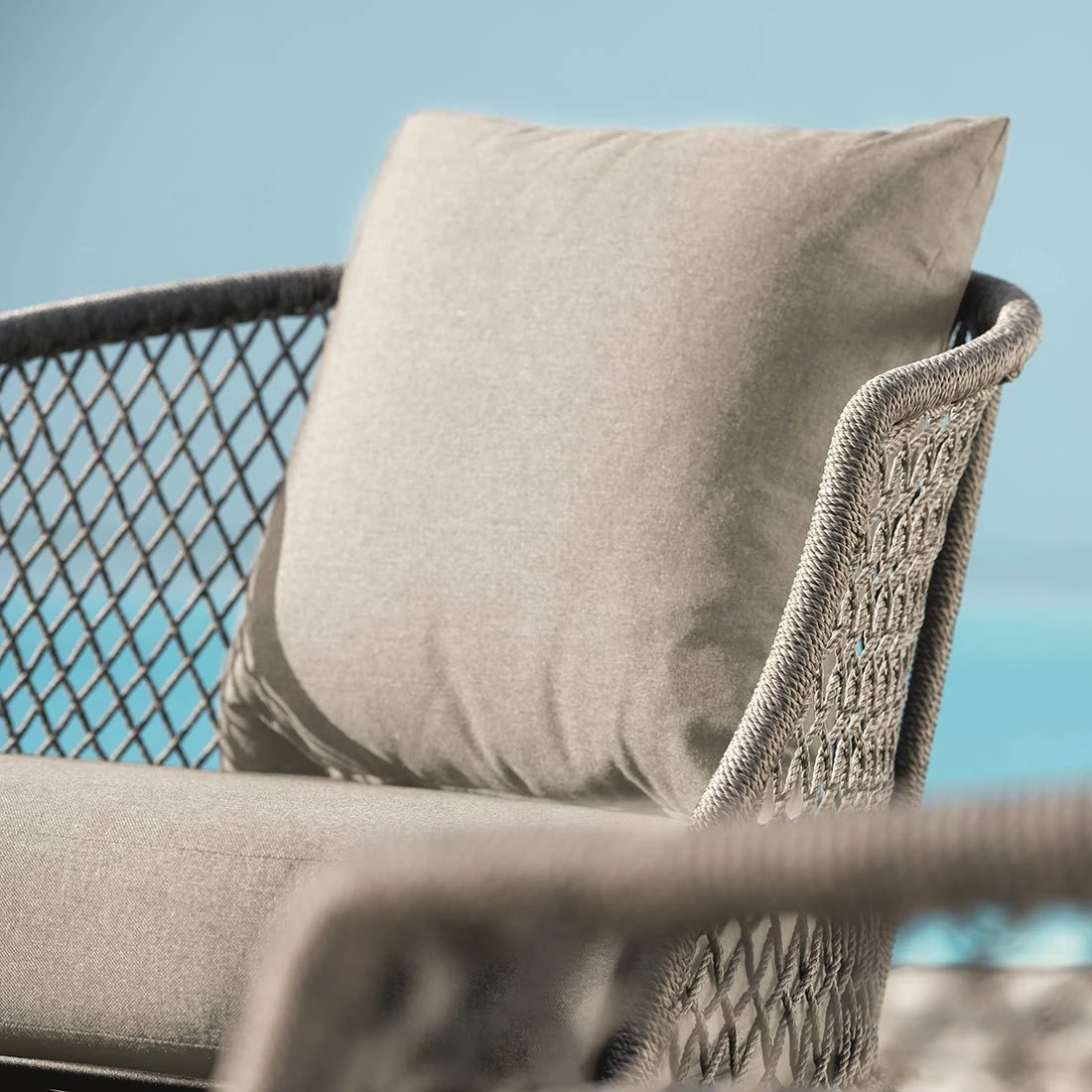 Für die Herstellung des Gestells wird hochwertiges und wetterfestes Aluminium verwendet. Farblich ist es in attraktivem Schwarz matt gehalten. Das Gestell ist mit Rope umflochten und bringt somit modernes Flair auf Ihre Terrasse. Die Sitzfläche ist aus robustem Outdoorstoff gefertigt. Bei langen Feuchtigkeitsperioden empfehlen wir für eine längere Haltbarkeit dennoch eine Lagerung der abnehmbaren Kissen im Inneren.