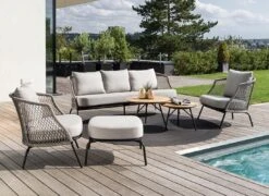 Als Material des Gestells hat der Hersteller wertiges Aluminium gewählt. Optisch begeistert das Gestell in der Farbe Schwarz. Das Loungeset ist mit einem robusten und wetterfesten Outdoorstoff bezogen. Dieser trotzt Wind und Wetter sehr gut. Wir empfehlen dennoch, die abnehmbaren Kissen bei länger andauernder Feuchtigkeit drinnen zu lagern. Die Farbe des Bezugs ist Cream. Die Tischplatte ist aus Massivholz gefertigt und dadurch für den Einsatz auf der Terrasse, im Garten und auf dem Balkon geeignet. Passend zum Gesamtbild des Loungesets begeistert die Tischplatte mit ihrer Farbgebung in Natur.