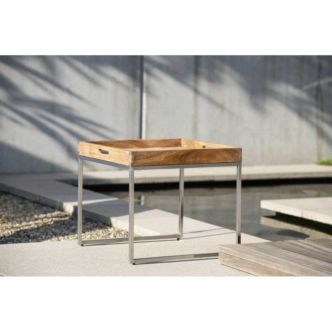 Das Gestell besteht aus pflegeleichtem und rostfreiem Edelstahl. Der moderne Look des Beistelltischs wird durch die attraktiven Kufen nochmals betont. Die Platte des Tisches ist aus hochwertigem Teak hergestellt. Durch den sehr hohen natürlichen Ölanteil ist sie bereits von Haus aus perfekt vor Witterungseinflüssen geschützt. Farblich ist die Tischplatte in einem schönen Teak Natur gehalten. Der Beistelltisch ist in seinem Design klassisch quadratisch gehalten.