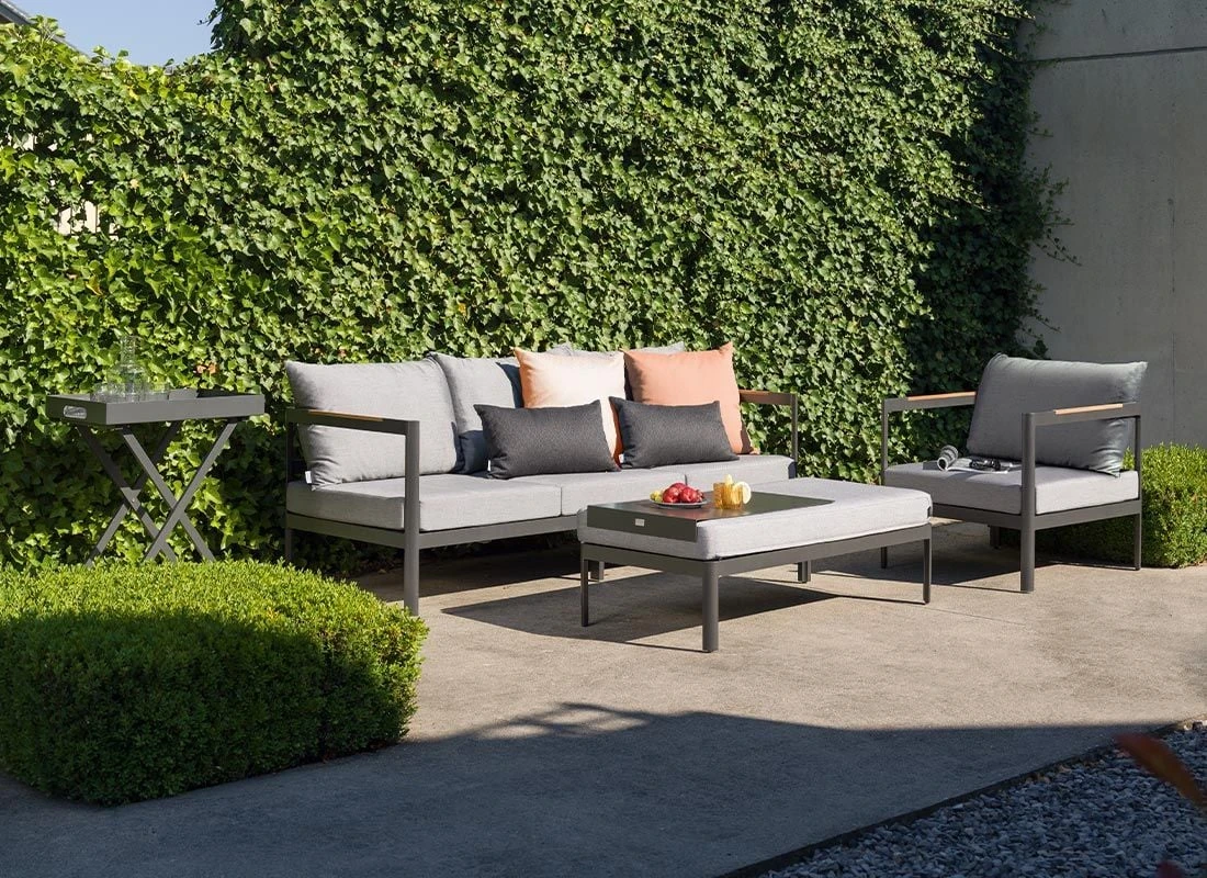 Das Gestell und die Tischplatte sind aus Aluminium gefertigt. Der Bezug ist aus robustem Outdoorstoff gefertigt, der Wind und Wetter gut standhält. Bei langen Feuchtigkeitsperioden empfehlen wir dennoch, für eine längere Haltbarkeit, eine Lagerung der abnehmbaren Kissen im Inneren. Die Farbe des Bezugs ist Seidengrau. Damit das Loungeset optisch ansprechend ist, sind das Gestell und die Tischplatte im Farbton Anthrazit gehalten.