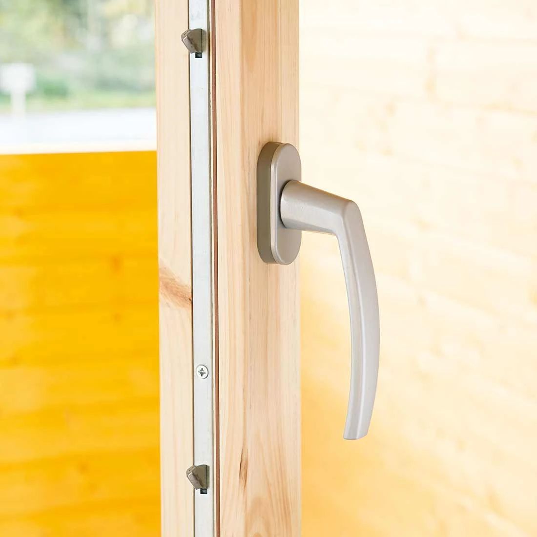 Weiterhin zeigt sich die hochwertige und optisch ansprechende Verarbeitung des Gartenhauses in der verglasten Leimholz-Doppeltür, die mit einer Drückergarnitur, einem Einsteckschloss und Profilzylinder ausgestattet ist. Durch die Verwendung von echtem Glas wird ein vorzeitiges Verkratzen verhindert und das Gartenhaus behält seine edle Optik.