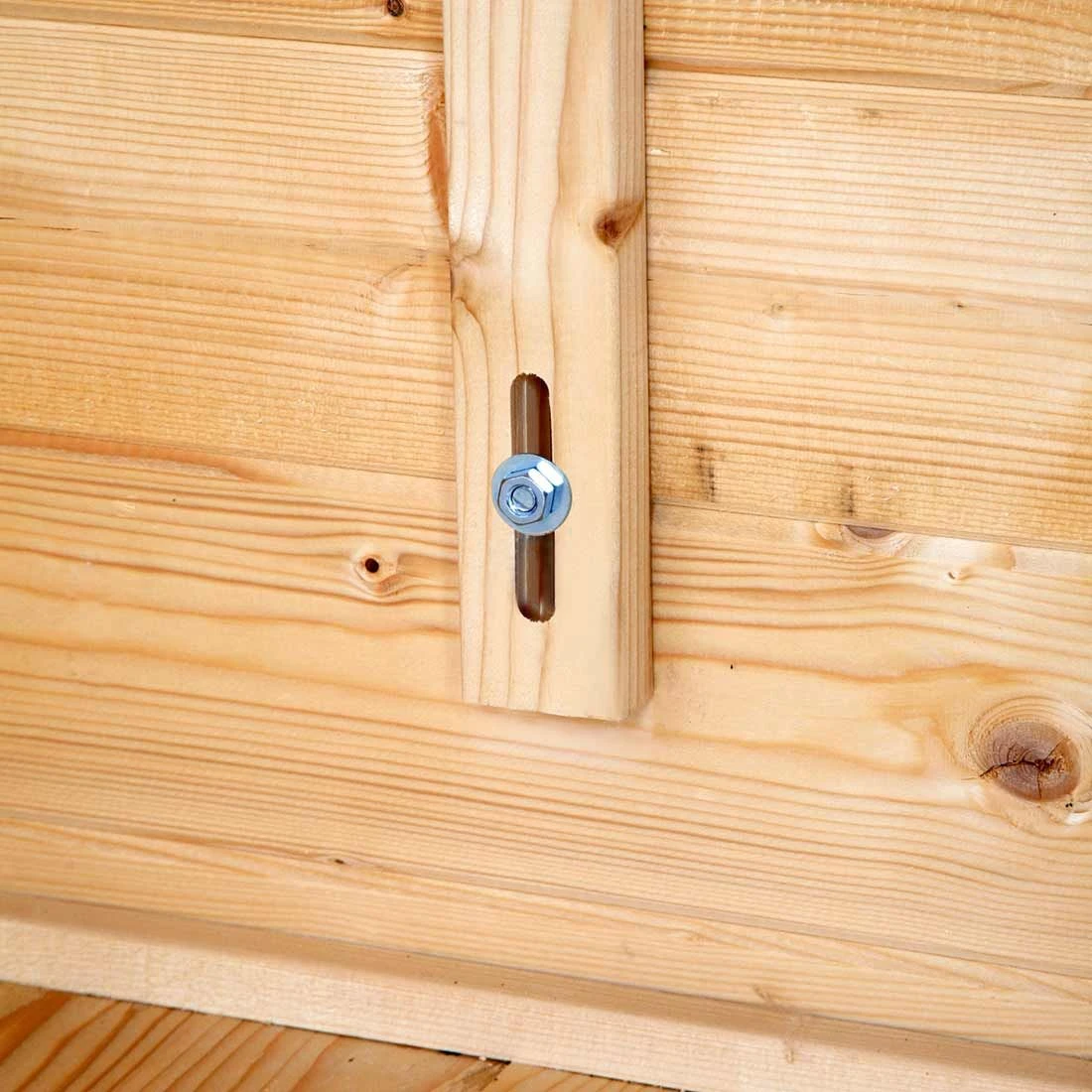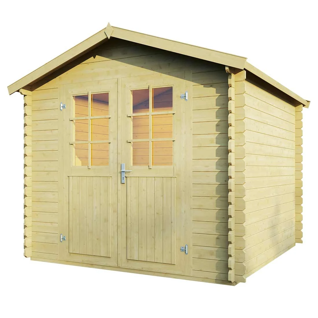 Weiterhin zeigt sich die hochwertige und optisch ansprechende Verarbeitung des Gartenhauses in der Leimholz-Doppeltür mit Sprossenfenster, die mit einem Profilzylinder ausgestattet ist.