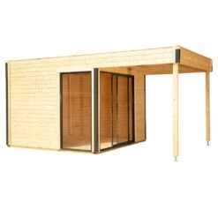 Das exklusive Wolff Finnhaus Studio 44-B Gartenhaus mit Anbau verbindet die Natürlichkeit von Holz mit modernen Alu-Designelementen. Die Eckverkleidungen und der Rahmen der hochwertigen Schiebetür sind in anthrazitfarbenem Aluminium gehalten und setzen so gekonnt einen modernen Kontrast zum Holz. Das Highlight des Gartenhauses ist die bodentiefe Verglasung über Eck. Sie verfügt über eine beidseitig zu öffnende Schiebetür, damit Sie bequem ins Innere gelangen.
