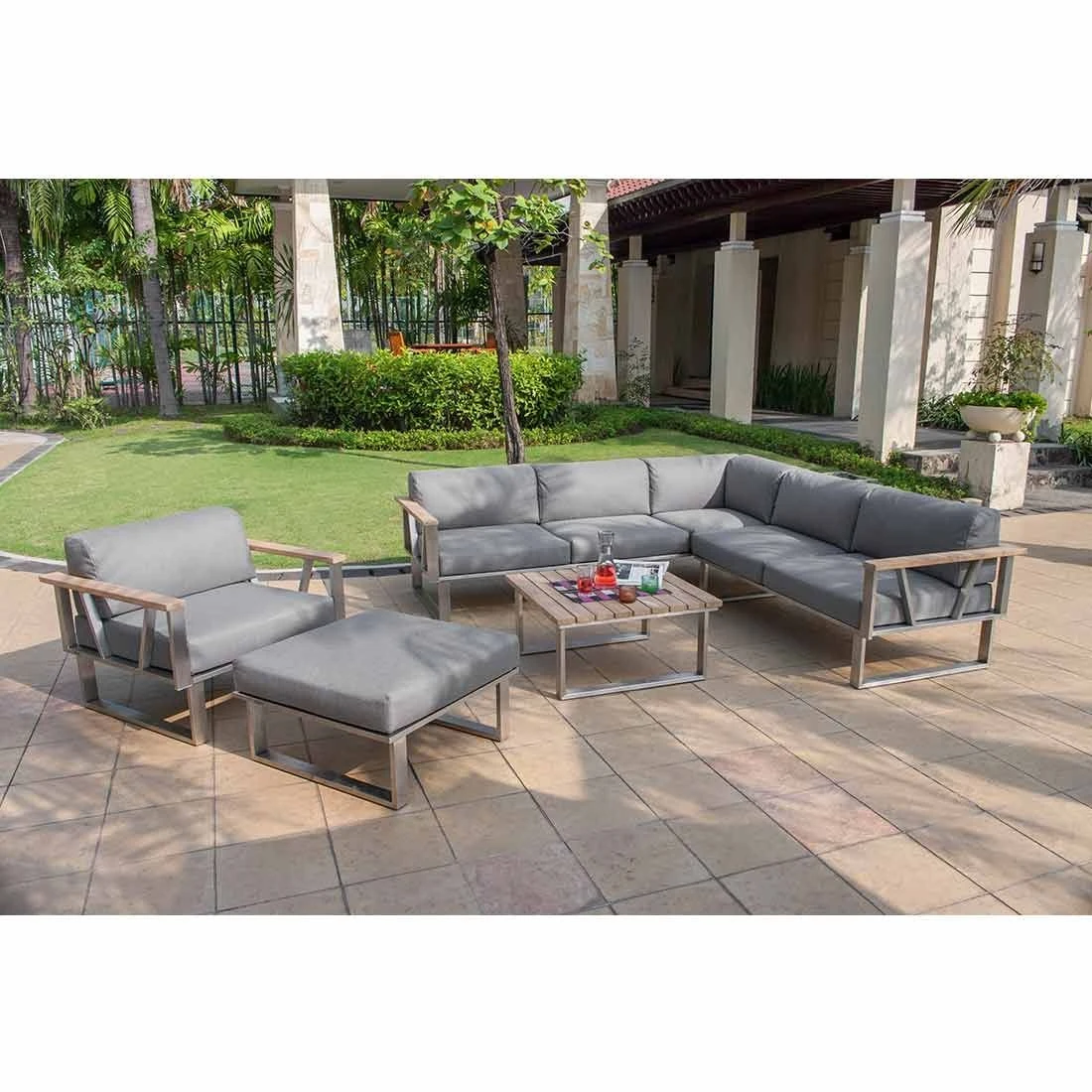 Die Sitzfläche und der Bezug sind aus Olefin gefertigt. Damit das Eck-/Endmodul optisch ansprechend ist, sind die Sitzfläche und der Bezug im Farbton Grau gehalten. Das Gestell des Eck-/Endmoduls besteht aus pflegeleichtem, rostfreiem Edelstahl. Optisch begeistert das Gestell in der Farbe Silber.