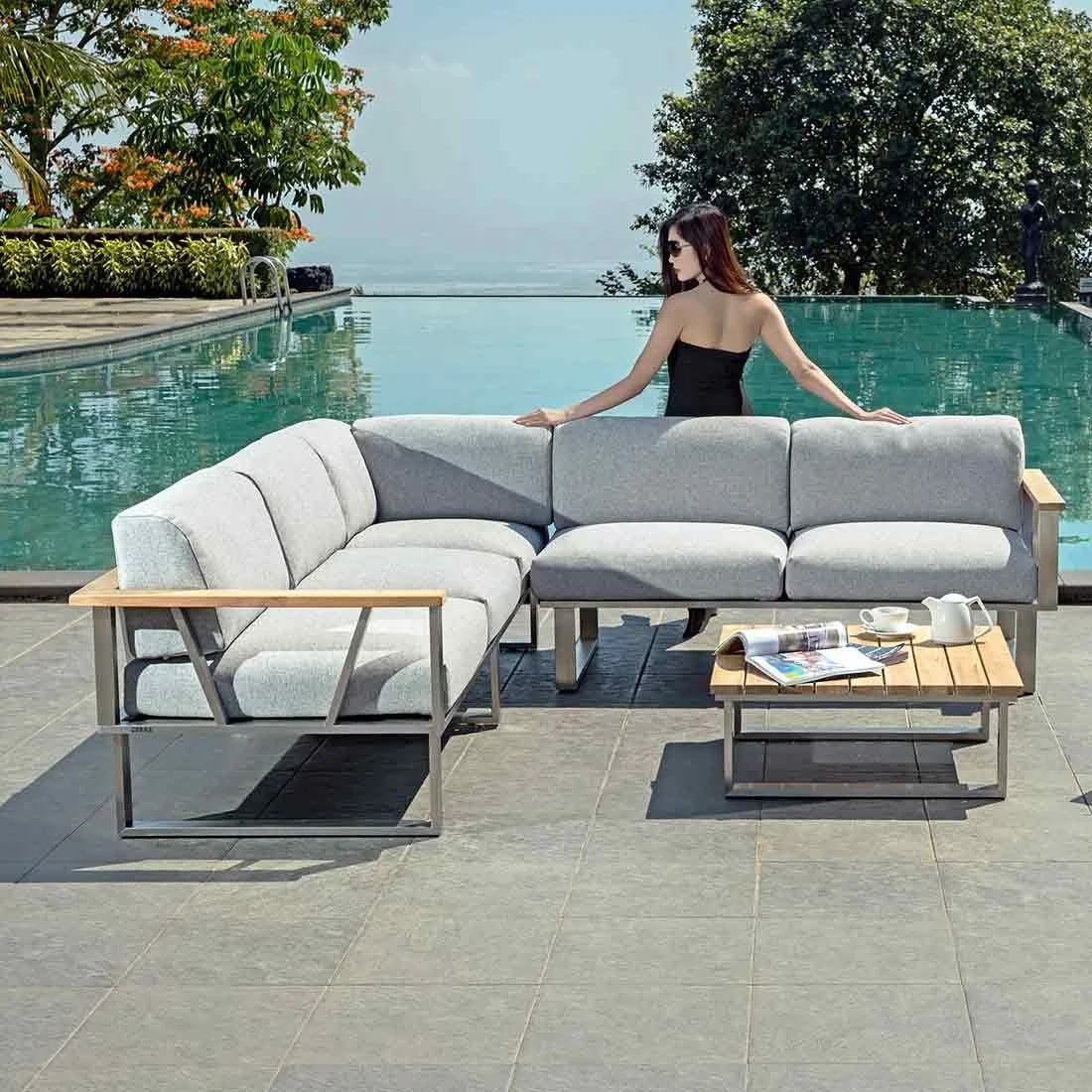 Die Sitzfläche und der Bezug bestehen aus Olefin. Damit die Ecklounge optisch ansprechend ist, sind die Sitzfläche und der Bezug im Farbton Grau gehalten. Das Gestell der Ecklounge besteht aus pflegeleichtem, rostfreiem Edelstahl. Optisch begeistert das Gestell in der Farbe Silber. Als Material für die Tischplatte wird das besonders hochwertige Hartholz Teak verwendet. Die Maserung des Holzes und der angenehme Farbton integrieren sich sehr schön in jegliche Arten der Garten- und Balkongestaltung und verströmen eine einzigartig natürliche Atmosphäre. Die Tischplatte ist Teak Natur.