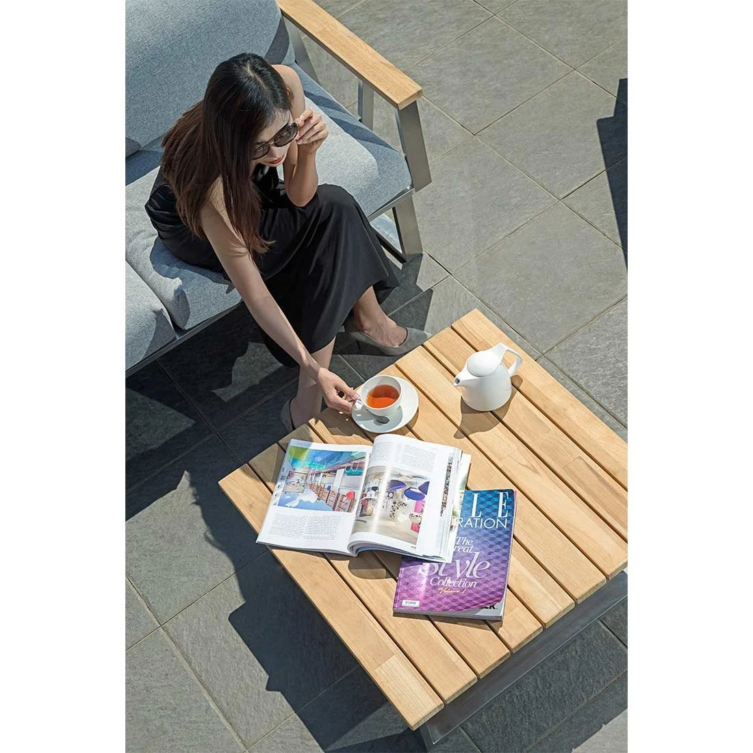 Als Gestellmaterial kommt hochwertiger, rostfreier Edelstahl zum Einsatz. Optisch begeistert das Gestell in der Farbe Silber. Die Sitz- und Rückenfläche ist aus dem Marken-Outdoorstoff Olefin gefertigt. Das Material verbindet eine angenehme Stoffoberfläche mit hoher Witterungsbeständigkeit. Denn sowohl Sonne als auch Regen können dem robusten Outdoor-Stoff kaum etwas anhaben. Die Tischplatte ist aus Natur gefertigt und dadurch für den Einsatz auf der Terrasse, im Garten und auf dem Balkon geeignet.