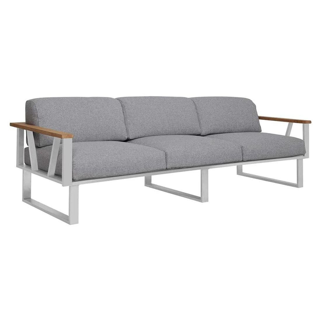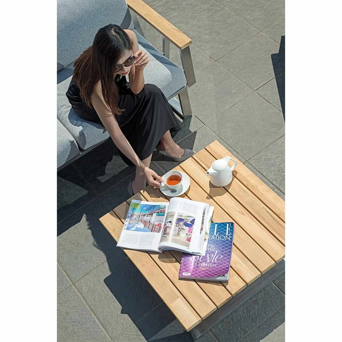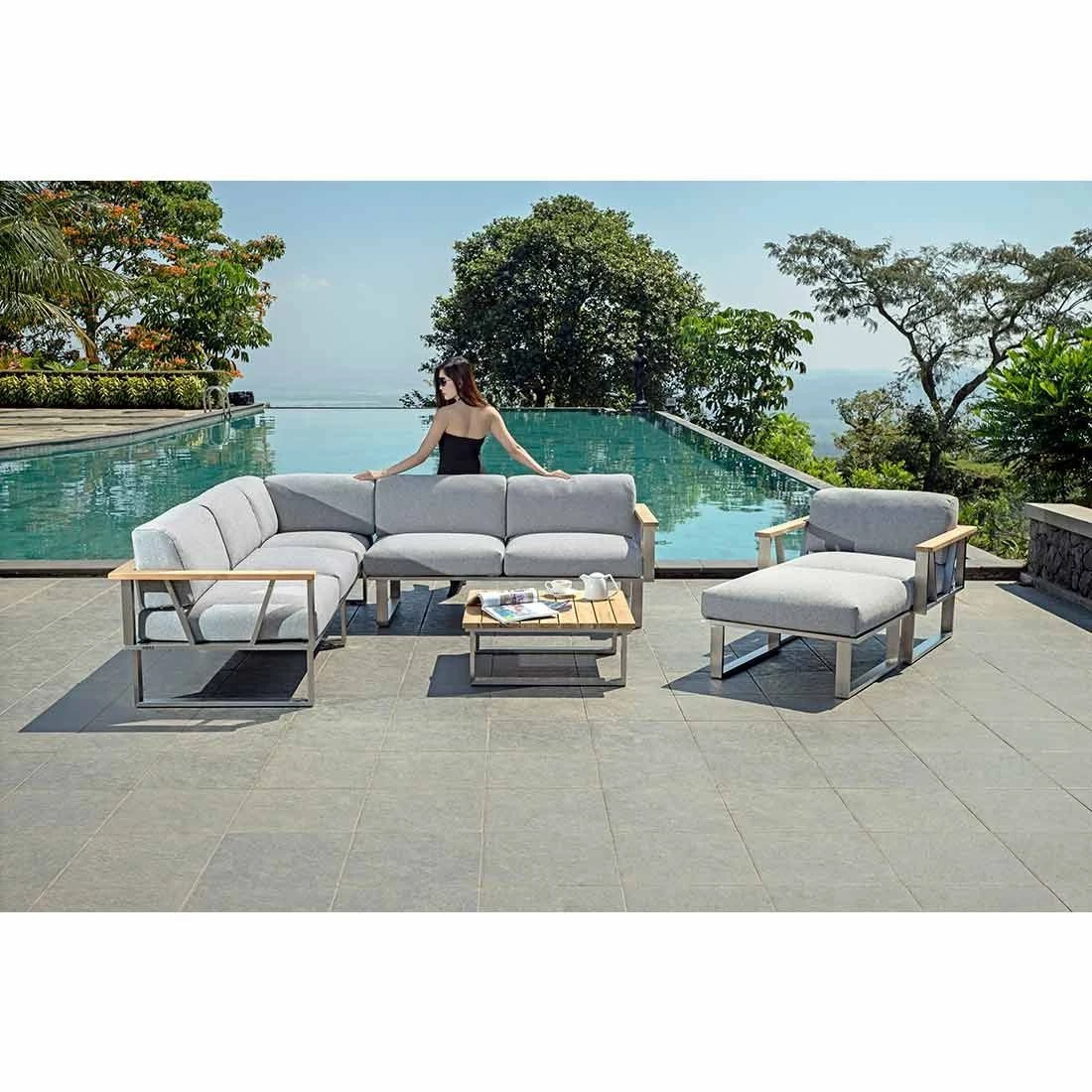 Damit die Ecklounge optisch ansprechend ist, sind die Sitzfläche und der Bezug im Farbton Grau gehalten. Aufgrund des etwas höheren Eigengewichts, steht die Ecklounge mit seinem Gestell aus hochwertigem Edelstahl besonders stabil und windsicher auf der Terrasse. Optisch begeistert das Gestell in der Farbe Silber. Für die Sitz- bzw. Rückenfläche wird Olefin verwendet. Der Marken-Outdoorstoff überzeugt mit einer hohen Witterungsbeständigkeit. Denn sowohl Sonne als auch Regen können dem robusten Outdoor-Stoff kaum etwas anhaben. Die Tischplatte ist aus wertigem Teak hergestellt. Mit ihrem hohen natürlichen Anteil an Öl ist sie bereits von Haus aus perfekt vor Witterungseinflüssen geschützt. Die Tischplatte ist Teak.