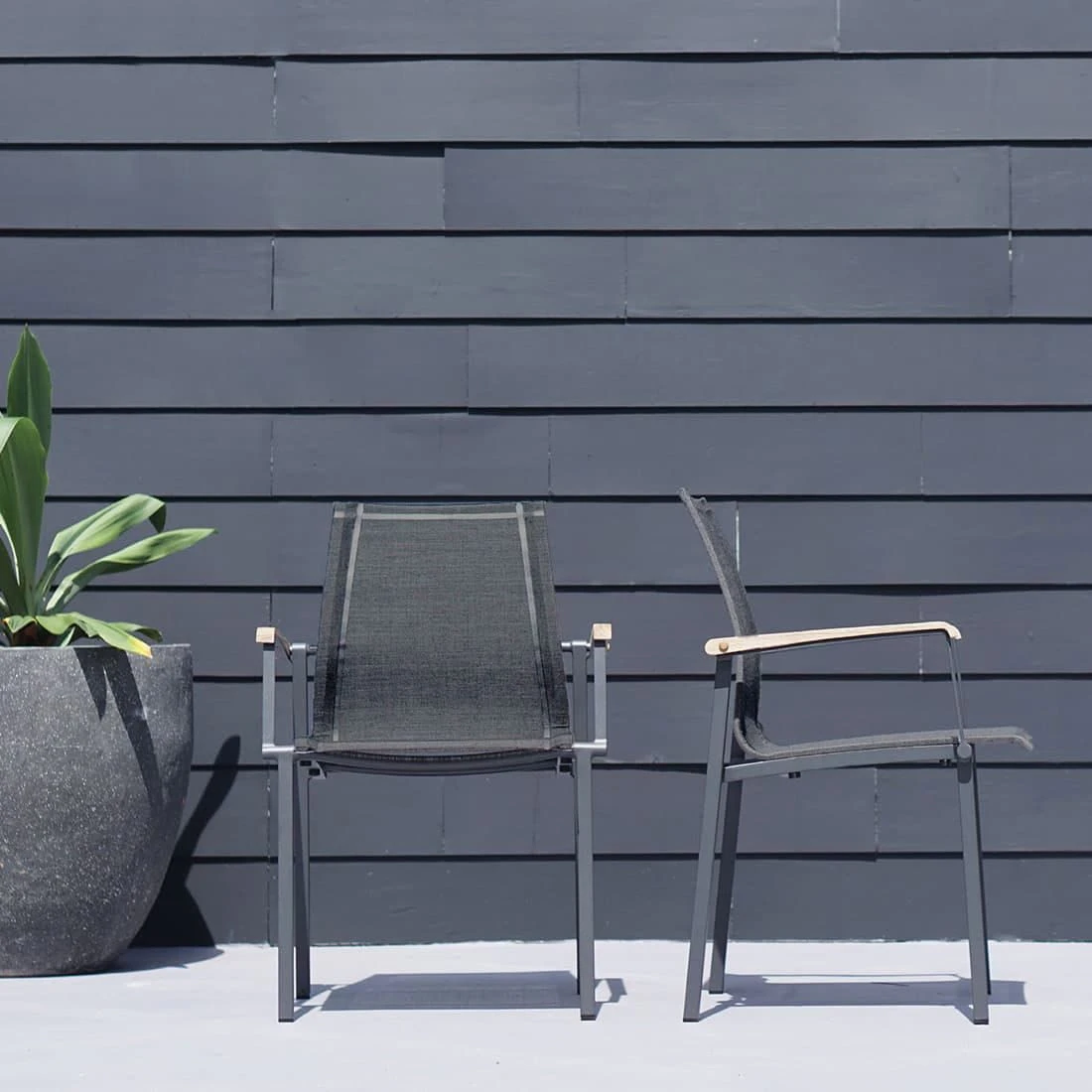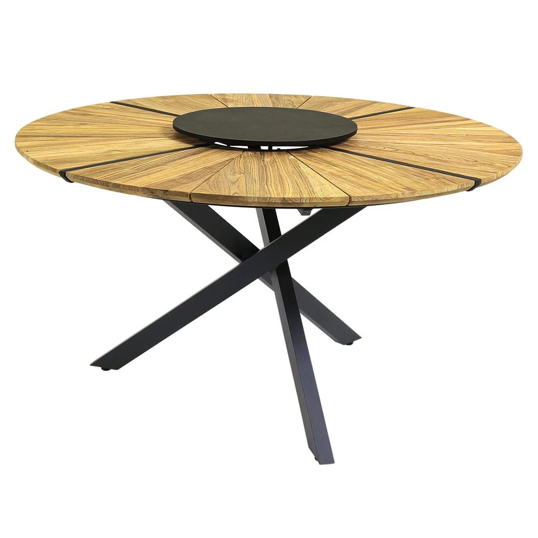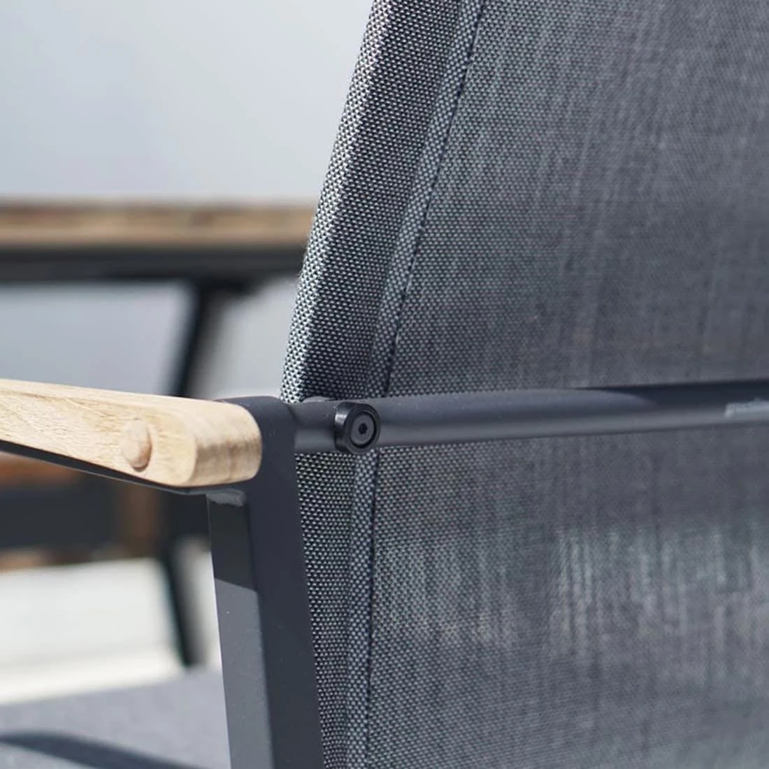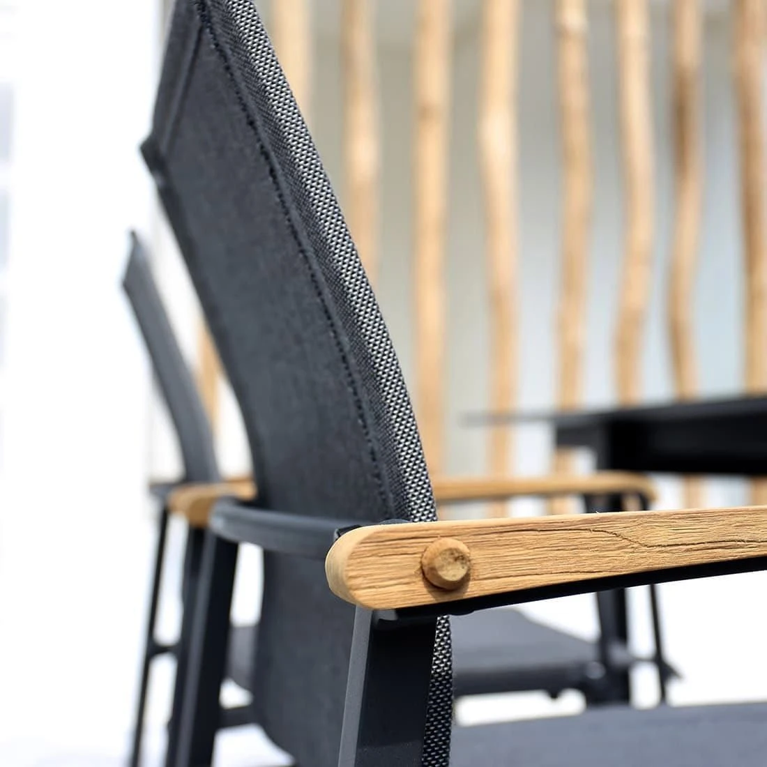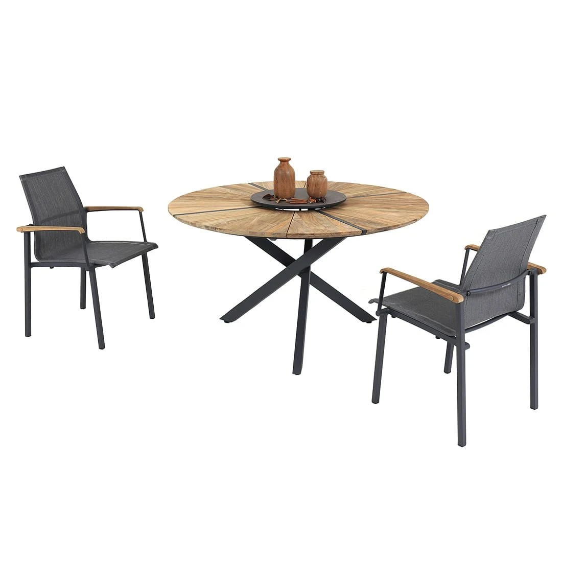 Die robusten Metallgestelle aus Aluminium sind pflegeleicht und garantieren gleichzeitig eine hohe Stabilität. Darüber hinaus gewährleistet dieses leichte Material, dass Sie die Möbel bequem transportieren können. Optisch ansprechend ist die Farbgebung der Gestelle in Aluminium. Ein weiteres Highlight ist die Bespannung der Sitzflächen mit Textilene. Dieses Material zeichnet sich durch eine hohe Robustheit gegenüber Hitze und Frost aus und ist leicht zu reinigen. Die Farbgebung der Sitzfläche ist Mitternachtsgrau. Zum Lieferumfang des Sets gehört auch ein praktischer Tisch. Die Gebrauchsspuren in der Tischplatte sind Teil der Formensprache der Tischplatte. Denn diese ist aus recyceltem Teak gearbeitet, das zuvor aus alten Hütten und Booten gewonnen wurde. Bei der Aufarbeitung werden dann Einkerbungen, Nagellöcher und Co. bewusst erhalten. Jede Tischplatte und damit jeder Gartentisch ist also ein Unikat. Passend zum Gesamtbild des Gartenmöbel-Sets begeistert die Tischplatte mit ihrer Farbgebung in Teak Natur. Alles andere als gewöhnlich ist das extravagante Tischgestell in X-Form. Die Form des Tisches ist klassisch rund.